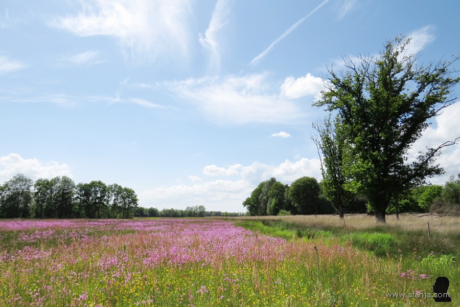 Korte tijd later reed ik onderweg naar huis langs een weiland waar een tiental ooievaars aan het foerageren was. De meesten liepen vrij ver weg, maar er scharrelden ook een paar ooievaars dicht achter het struikgewas langs de weg. Morgen nog wat foto’s van dit tweetal …