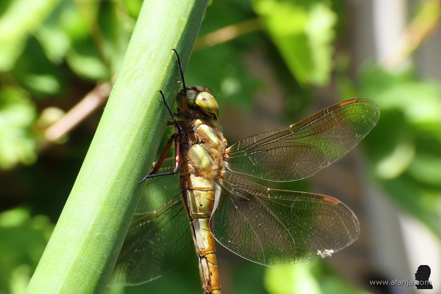 Nadat ik de laatste foto van de houtpantserjuffer had gemaakt, terwijl hij aan het stokje hing, maakte ik een beginnersfoutje. Ik liep een stap te ver naar rechts, waardoor ik hem in de schaduw zette. De vogel juffer was meteen gevlogen …