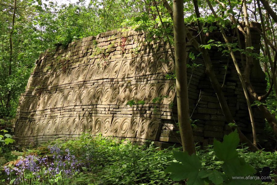 Aan het eind van de wand volg ik het paadje naar rechts. Daar sta ik aan de voet van de hoge bouwwerken aan het eind van het grondgebied van de Ecokathedraal. De wand is goeddeels bekleed met klimop en aan de voet liggen enkele deels vergane boomstammen …