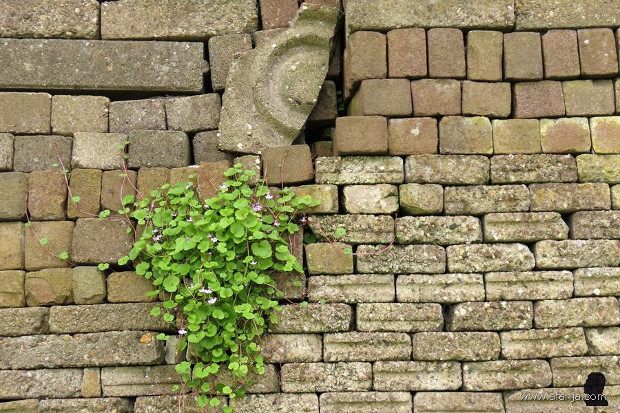 Het pad voert de bezoeker hier normaal gesproken tussen de bouwwerken door naar boven. Terwijl Aafje hier op mij blijft wachten, verlaat ik het gebruikelijke pad om buitenom langs een hoge wand helemaal naar achteren te lopen …