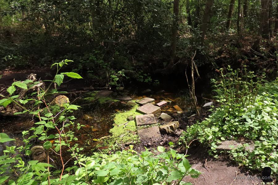 Als ik me omdraai, sta ik voor het slootje dat de Ecokathedraal begrenst. Een geïmproviseerde, waarschijnlijk clandestien aangelegde oversteekplaats leidt naar de overkant. Maar avontuurlijker geesten kunnen natuurlijk ook gebruik maken van de boombrug …