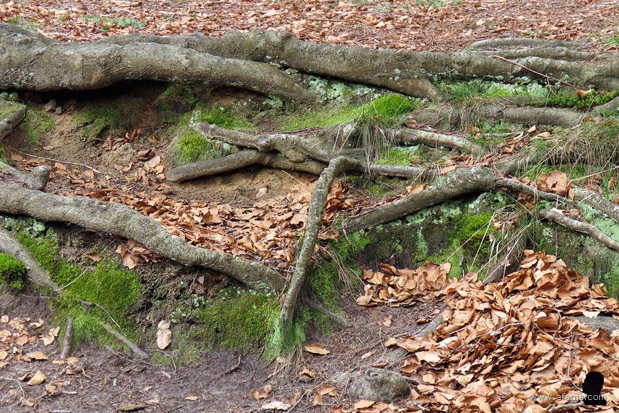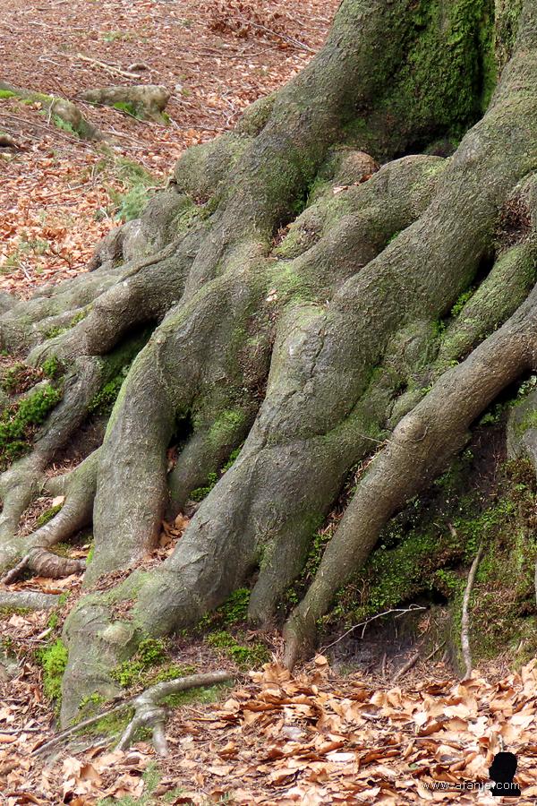 Al snel waren we terug bij de grootste van de oude woudreuzen. Ditmaal richtte ik mijn camera eerst eens op het enorme wortelstelsel dat deels bloot ligt. We kunnen wel stellen dat deze beuk op grote voet leeft …