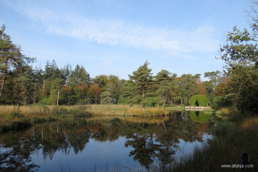 Kijkend naar de verkleurende bladeren die vrijwel roerloos vlak boven me hingen, heb ik een tijdlang lekker op het bankje zitten mijmeren,  Het bankje was een soort kantelpunt in deze fotokuier: het was een kwestie van doorzetten tot aan de Freulevijver òf nu omkeren. Hoewel het eerste deel van de wandeling intussen al goed voelbaar was in mijn bovenbenen, besloot ik toch voor de eerste optie te kiezen. Op deze dag zou ik het met pijn en moeite kunnen redden om er te komen en dan ook nog weer de terugweg naar de auto te volbrengen … Het is maar zeer de vraag of ik volgend jaar nog eens een herkansing krijg, bedacht ik me …