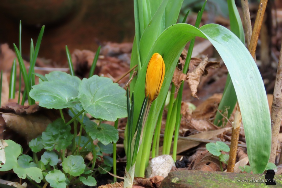 Na de paarse krokus is het tijd om zijn gele neefje in het zonnetje te zetten. Achter in de tuin staat een fraai exemplaar dat eind februari beschutting trachtte te zoeken bij een vroege tulp …
