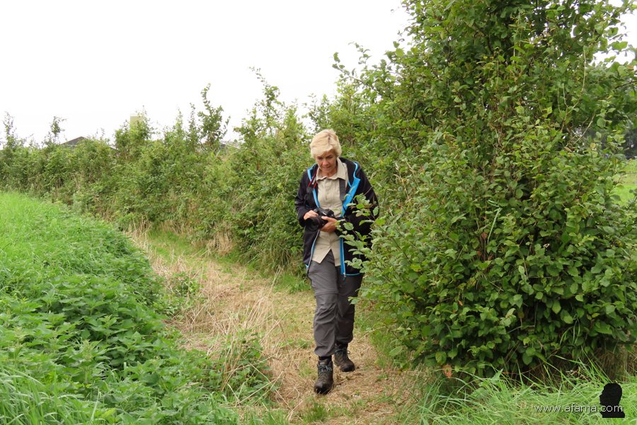 Terwijl Jetske en ik op zoek naar mooie standpunten wat rond stapten, ontdekte ik een smal, vanwege de helling moeilijk begaanbaar paadje tussen het akkerland en de terp. Hoofdschuddend kwam Jetske achter me aan. Hoe heb je het weer voor elkaar gekregen …? zei ze lachend …