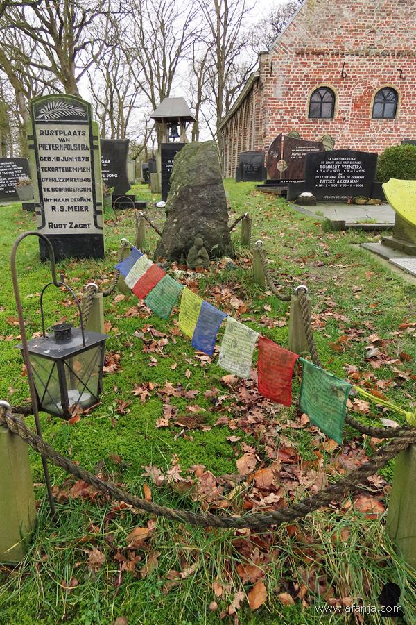 In de noord-oostelijke hoek van het kerkhof van Brongerga bevindt zich de familiegrafkelder van de Van Scheltinga’s. De grafkelder op zich is minder opvallend. Op enige afstand zien we de beluchtings-pijpen op wat we een soort grafheuvel zouden kunnen noemen …