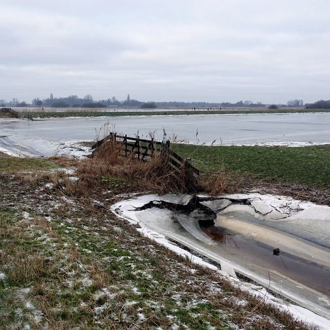 Een stuk verderop heb ik nog eens een tussenstop gemaakt om het resultaat van de bemaling van Wetterskip Fryslân te kunnen bekijken. Een groot deel van het water in de retentiepolder is al weggepompt, daardoor is het ijs boven sloten al volledig ingestort …