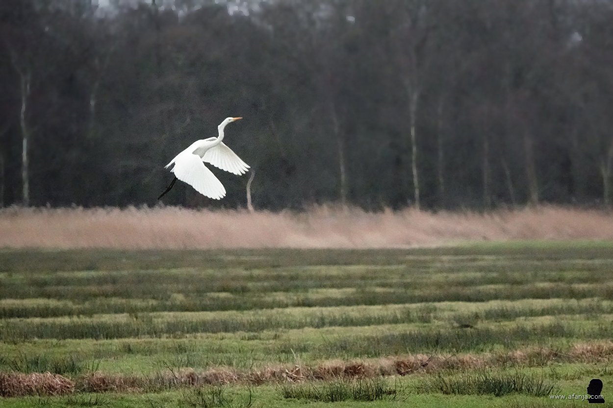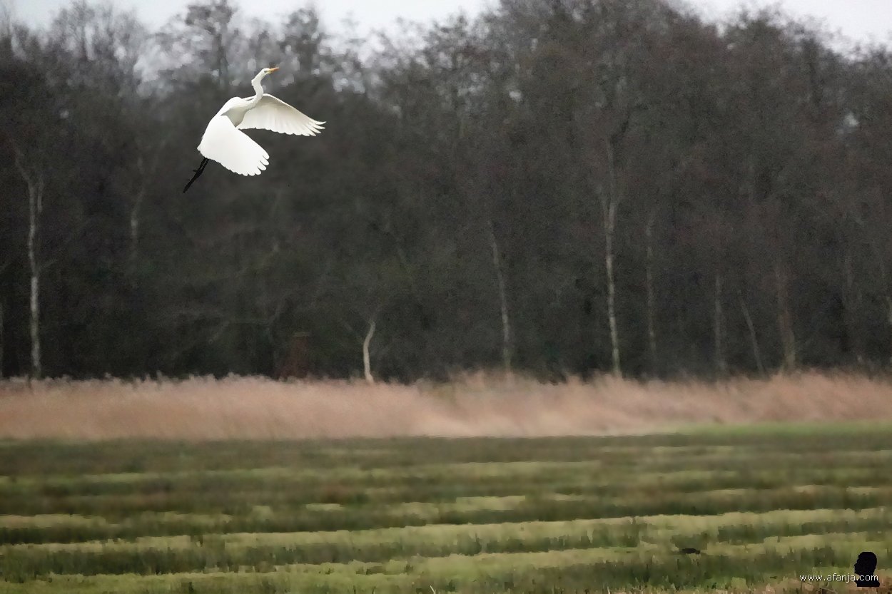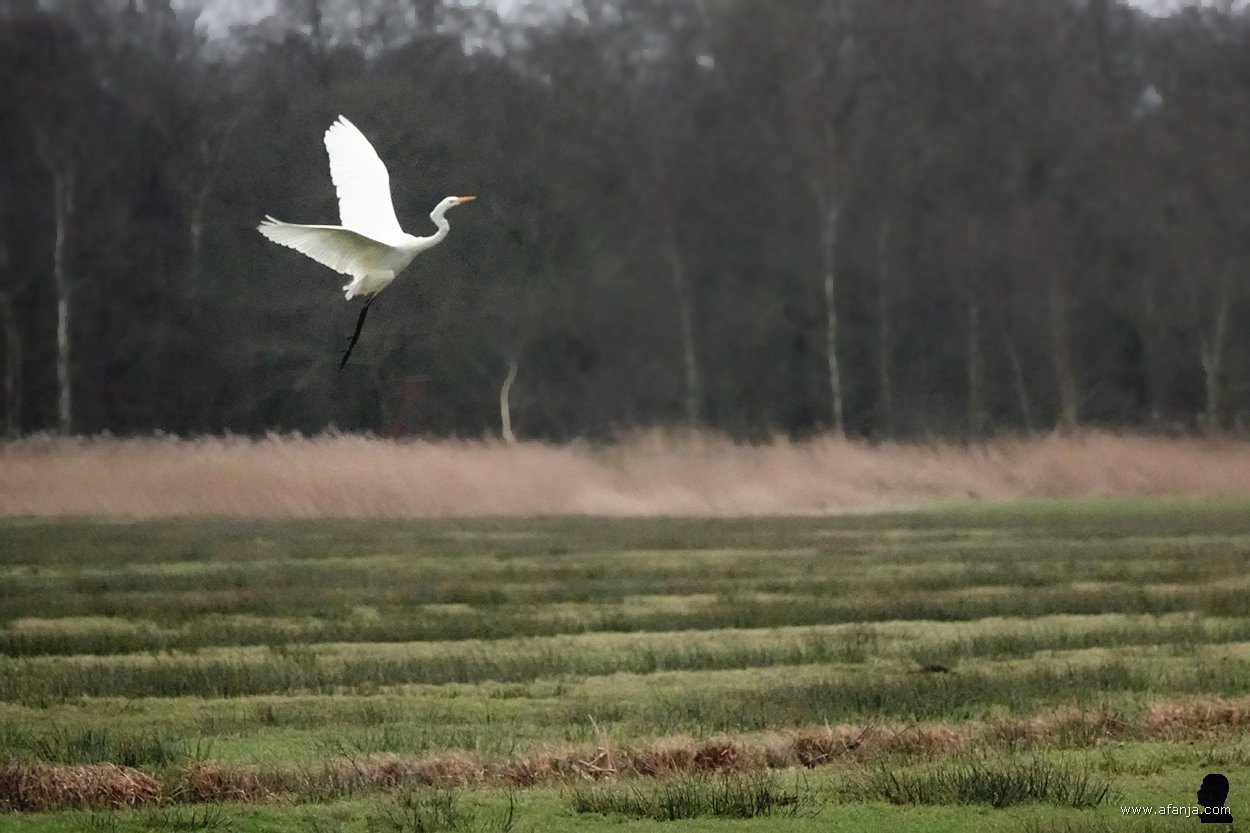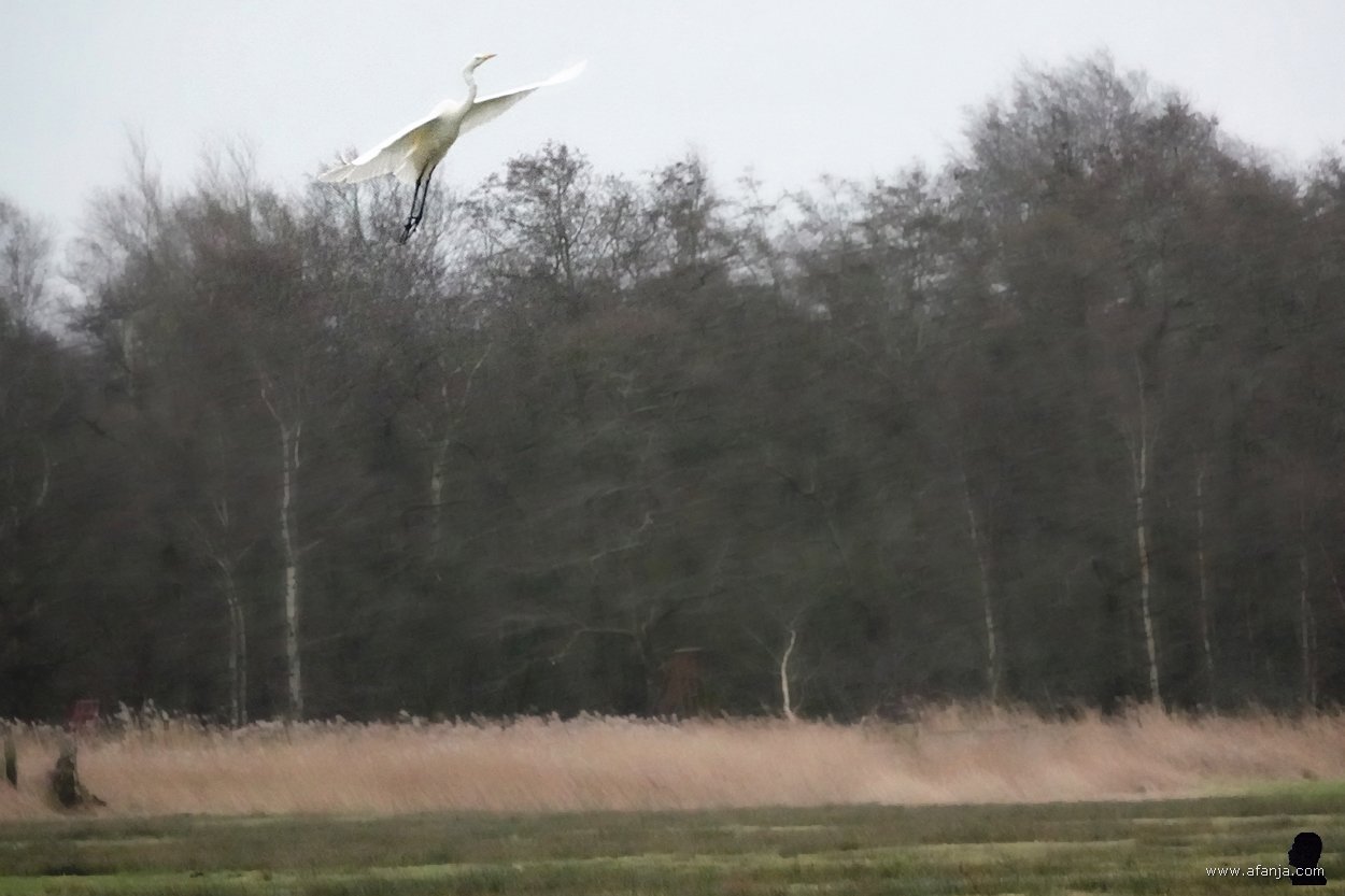 En zo was het ook. Terwijl wij de vogelkijkhut betraden, ging de zilverreiger er vandoor. Door een kijkopening aan de oostkant van de hut zag ik aan het kleine stipje in de verte, dat hij nu plekje langs de weg had opgezocht. Gelukkig stond er aan de weestkant van de hut ook een grote zilverreiger. En meer nog, er stond ook een blauwe reiger aan de waterkant …