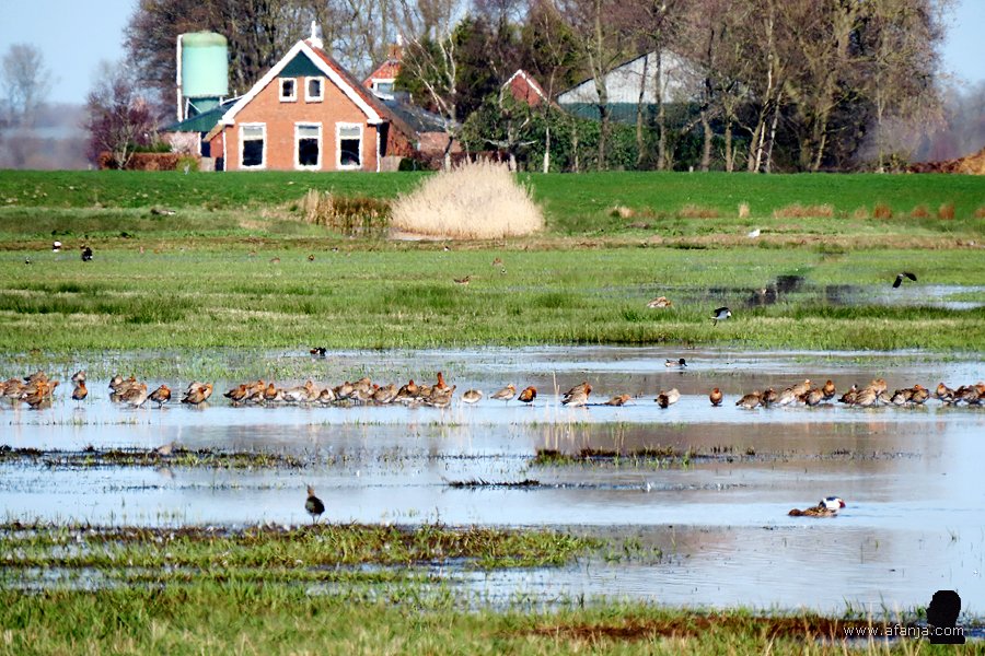 Ze zaten zoals gebruikelijk na hun lange reis uit zuidelijker oorden weer ver weg. De meesten zaten in de natste delen van het land lekker wat in en bij het water om weer aan te sterken na de lange reis. Er zaten ook ditmaal weer vooral grutto’s. Verder zag ik er wat kieviten, een enkele tureluur en er leken ook nog ’n paar kemphanen te zitten …