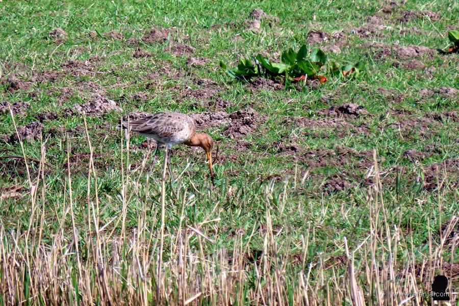 In het plasdrasland links van de weg stonden tientallen grutto’s druk te poetsen. Verderop scharrelden diverse eenlingen en koppeltjes rond. Even later streek er rechts van de weg op korte afstand een grutto bij een kleinere plas neer …
