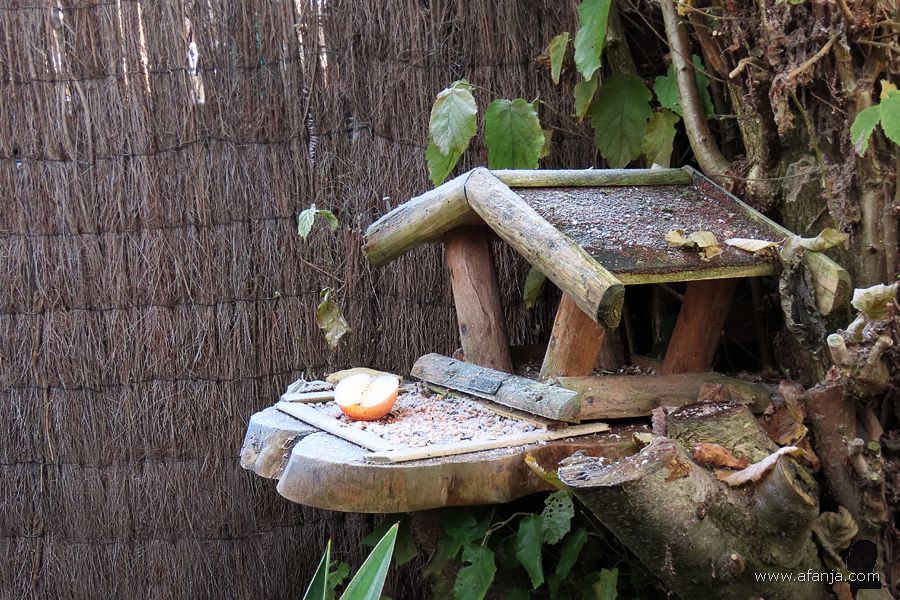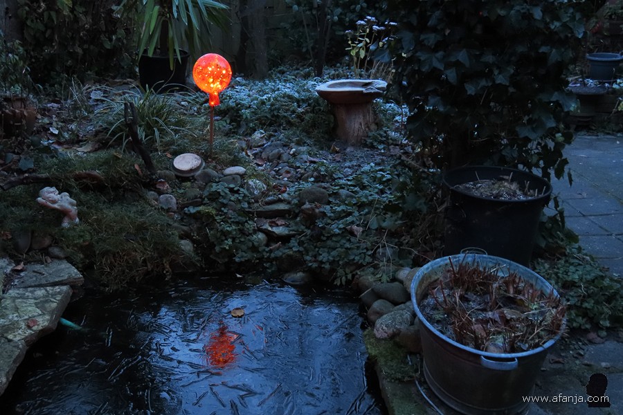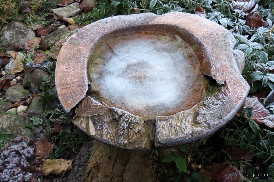 Zo’n laat herfstblad, dat op het ijslaagje van de vijver is neergedwarreld, of het berijpte houten vogelbadje met zijn mooie structuren, daar kan ik in eigen tuin dan toch ook wel van genieten …