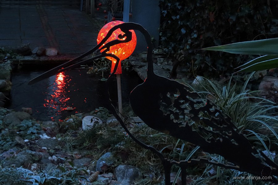 Bij het invallen van de duisternis begon de heksenbol mooi op te lichten. Met dank aan de kerstlampjes die ik er een paar dagen eerder in had gedaan. Vanuit het juiste standpunt bekeken, had ook de grutto daar baat bij …