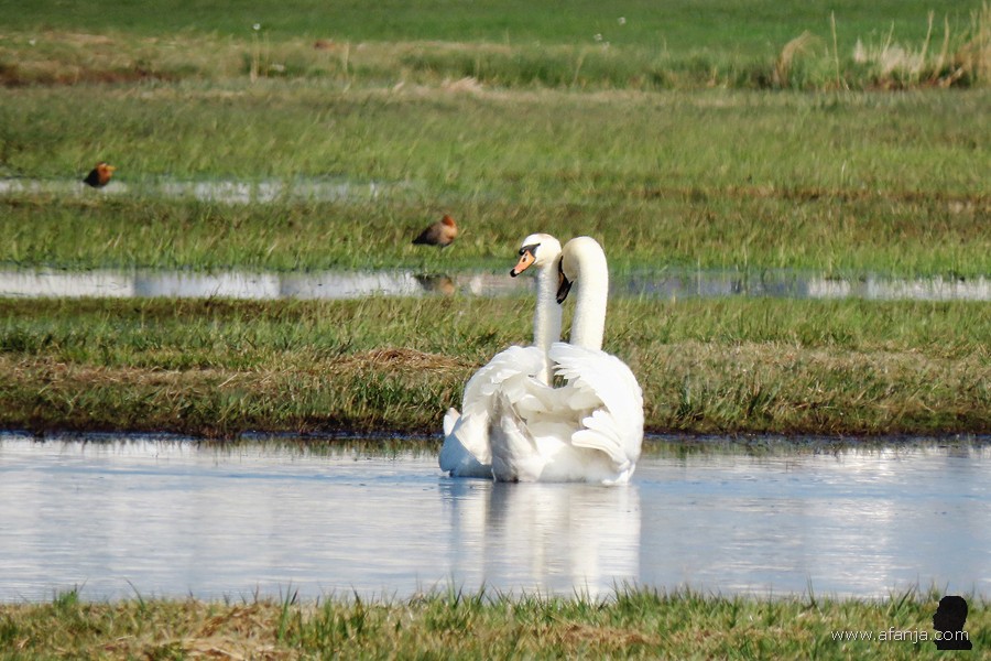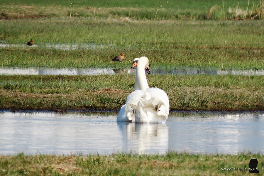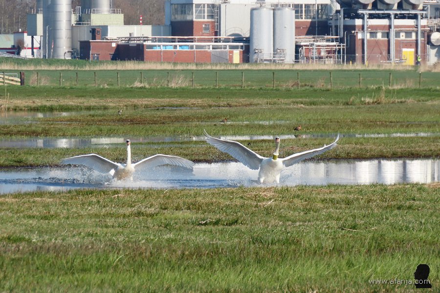 Veel gelegenheid om zo fraai en rustig rond te stappen, kreeg PP91 niet. Al vanaf het moment dat de twee zwanen in de sloot landden, werd PP91 op de huid gezeten door de andere zwaan. Ik kreeg dan ook al snel het idee dat het levenspartners waren. Half vliegend, half rennend stoven ze verschillende keren over land en water achter elkaar aan. Tussendoor werd af en toe een korte pauze ingelast om op adem te komen …