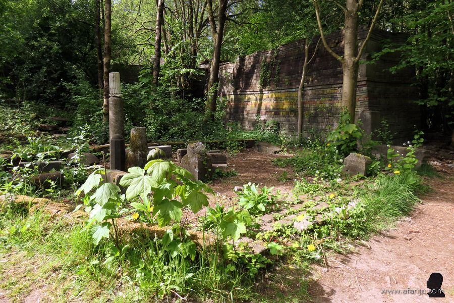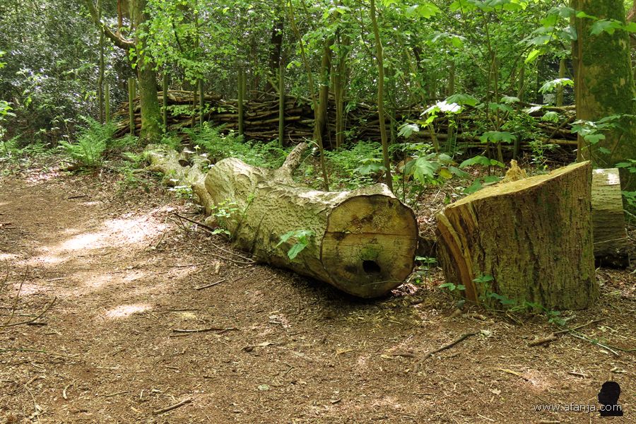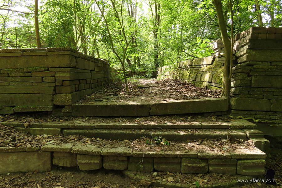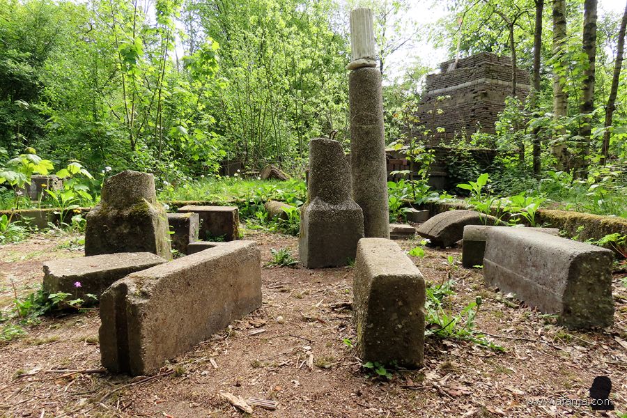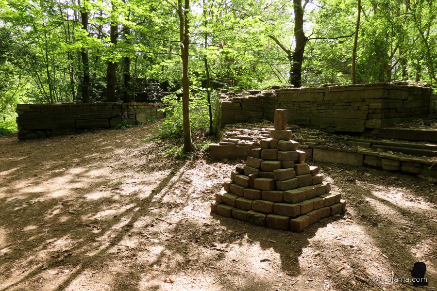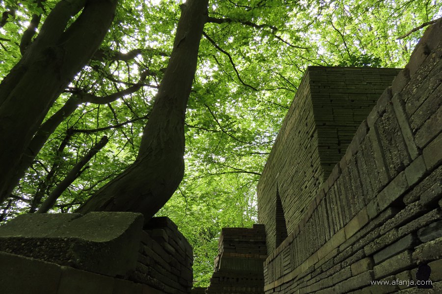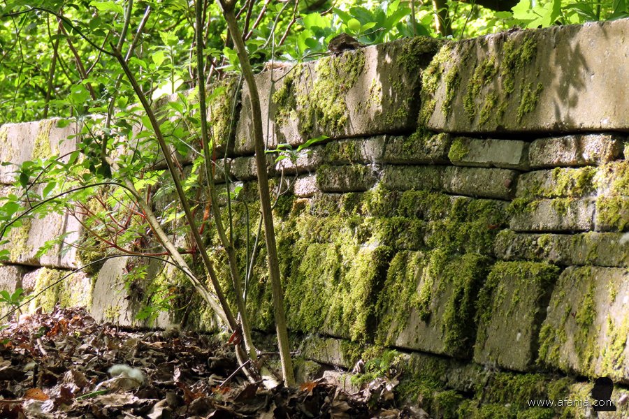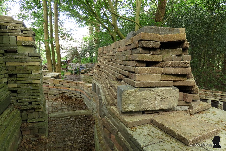 Bij het koepelbouwwerk ligt wat snoei- en afvalhout afkomstig van één de bomen, die onlangs zijn gesneuveld. De boom zelf ligt een paar meter verderop nog over een paar lagere bouwwerken. Ook verderop is goed te zien dat sommige bomen en struiken hun beste tijd hebben gehad. Komen we in het achterste deel, dan lijkt de schade weer mee te vallen. Dat is misschien te verklaren uit het feit dat daar in de loop der jaren al meer bomen tegen de vlakte zijn gegaan …