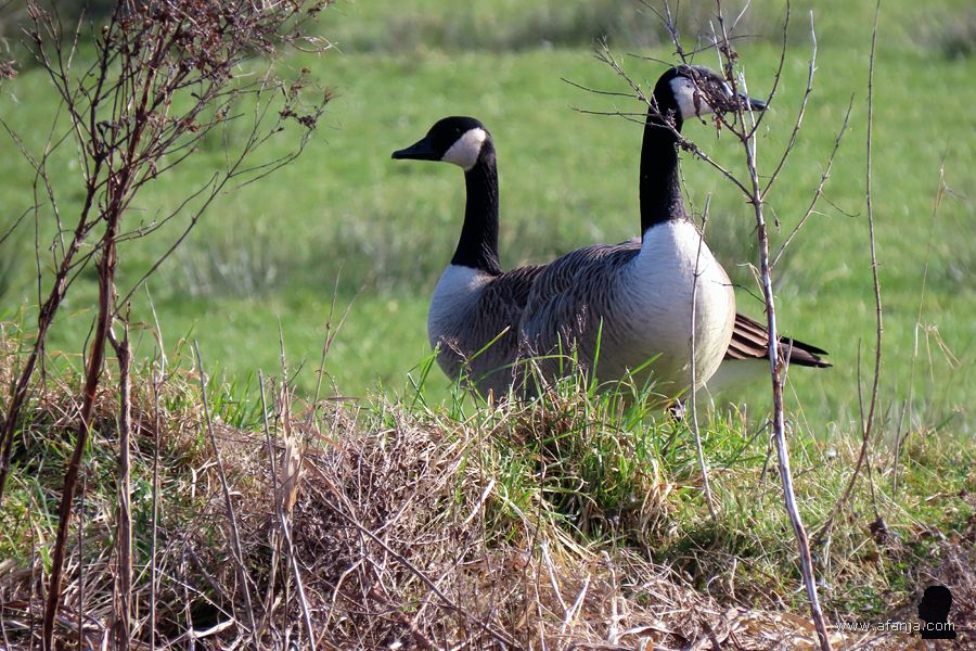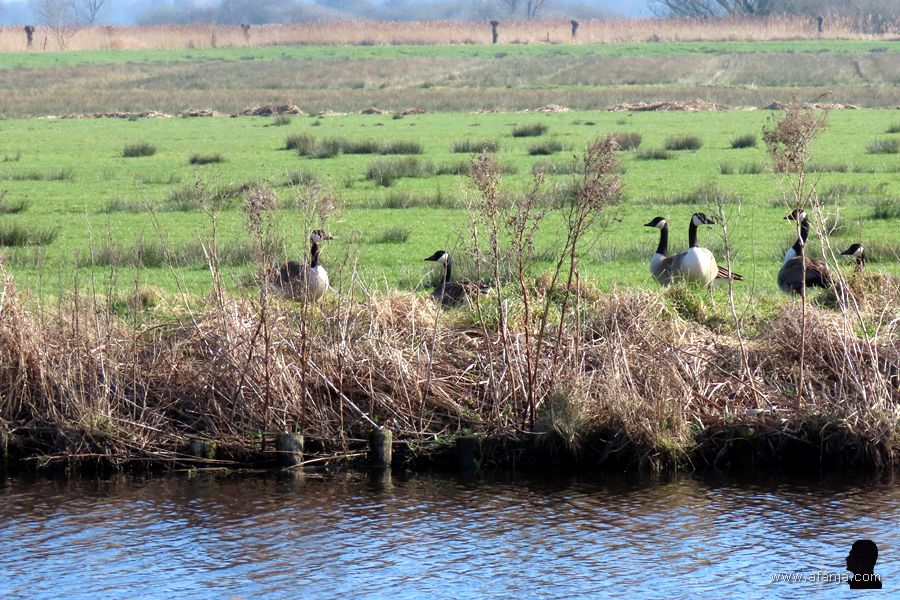 Gelukkig werd de lange rechte kuier een paar maal onderbroken door een paar lokale bezienswaardigheden. Om te beginnen stond er ergens halverwege een aantal Canadese ganzen aan de overkant van het kanaal. Mogelijk waren het de ganzen, die ik op de heenweg al was tegengekomen, toen ze vanaf de Leijen deze kant op kwamen …