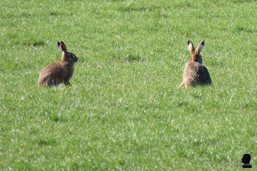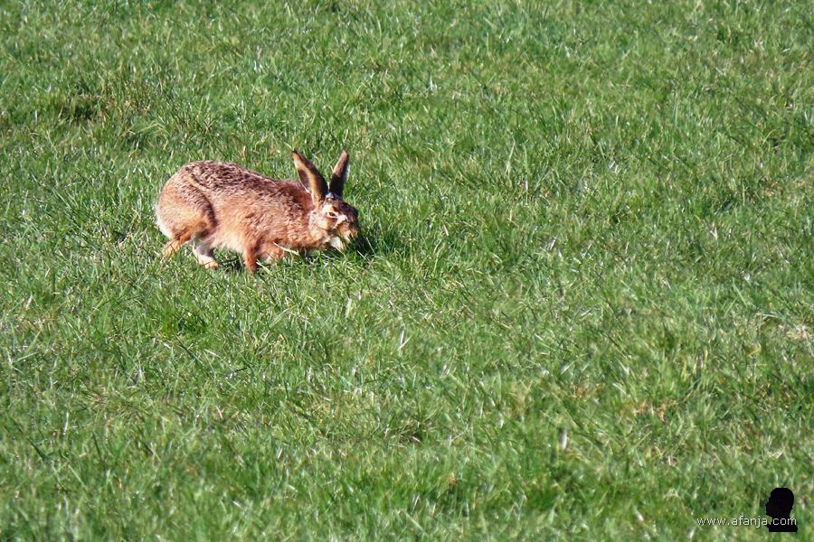 In de aanloop naar Pasen heb ik de laatste tijd diverse malen het genoegen gehad om rammelende hazen in de weilanden rond te zien rennen. Meestal waren ze me te snel af voor de foto. Eén keer heb ik wat video-opnamen kunnen maken van een race door de landerijen. En voor dit logje waren dhr. en mevr. Haas (Lepus europaeus) bereid om samen in alle rust even de tijd voor me te nemen …