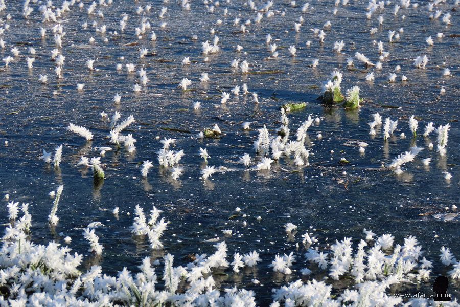 De vaarweg tussen Drachten en Earnewâld lag nog helemaal open. De laatste keer dat daar ook een mooie laag ijs op lag, was in februari 2012. Maar dat kon de pret niet bederven, want voorbij de bomen lag links van de Hooidamsloot een mooie ijsvlakte …