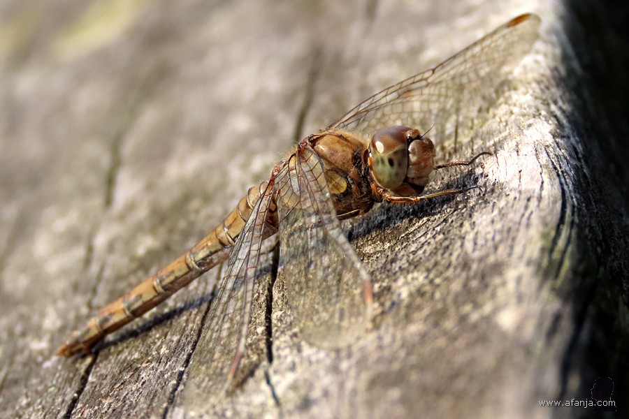 In de periode 2005-2015 maakte ik gemiddeld twee keer per week een fotokuier in het Wijnjeterper Schar, in het Fries: Weinterper Skar. Dit is een klein Natura 2000-gebied ten zuidoosten van Drachten. Wanneer ik daar op één van de bankjes neerstreek, kwam er regelmatig een libel of waterjuffer bij me zitten. Deze bruinrode heidelibel kwam er in september 2007 even gezellig bij …