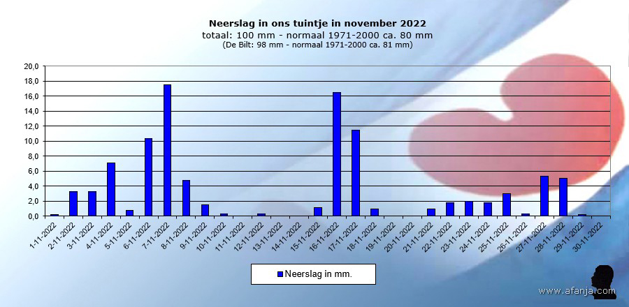 Met een gemiddelde temperatuur van 8,2°C in onze tuin was november net als de 10 voorgaande maanden zacht. Alleen rond de 20e daalde de temperatuur een aantal dagen en vroor het ’s nachts een paar maal heel licht. Behalve zacht was november ook nat, in ons tuintje viel 100 mm neerslag. Landelijk was dat gemiddeld ca. 90 mm, maar de verschillen waren weer groot tussen het noordwesten en het zuidoosten …