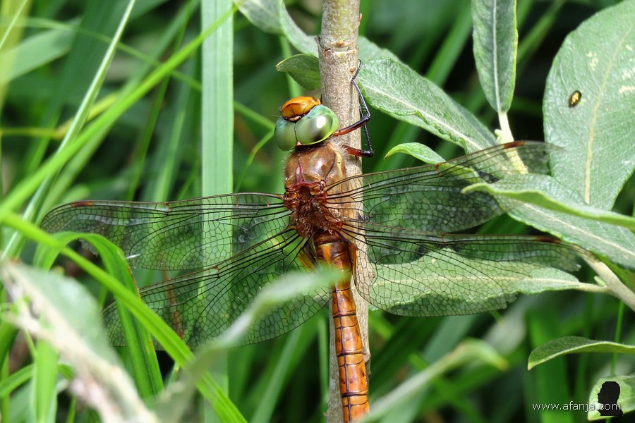 Zo ging dat een tijdje door. We hadden het best gezellig samen. Pas toen ik later op de middag de foto’s op de pc bekeek, zag ik dat de libel tussendoor kennelijk een cadeautje voor me had meegenomen. Er leek een heel klein beestje op de linkervleugel van de libel te zitten. Maar eh … wat is het eigenlijk? Kan het een bijna microscopisch kleine cicade zijn …?