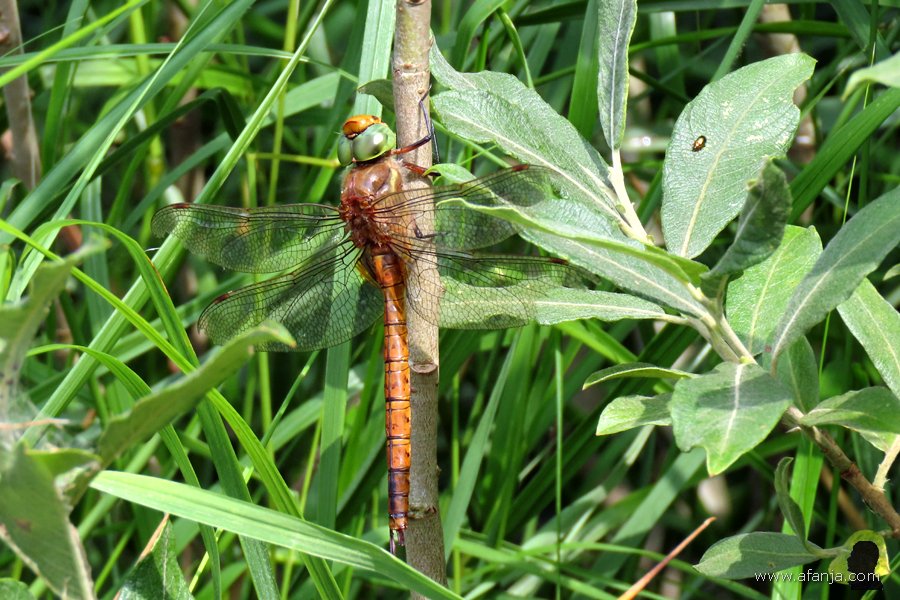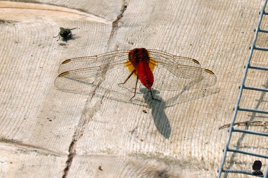 Na mijn rondgang door de parktuin van Huize Olterterp heb ik via landelijke wegen een ritje gemaakt naar de Alde Ie. Dat is voor auto’s een doodlopend weggetje waar aan het eind een oud en verweerd bankje staat (Google Maps). Terwijl ik ging zitten om me in de zon te nestelen, zag ik een libel wegvliegen …