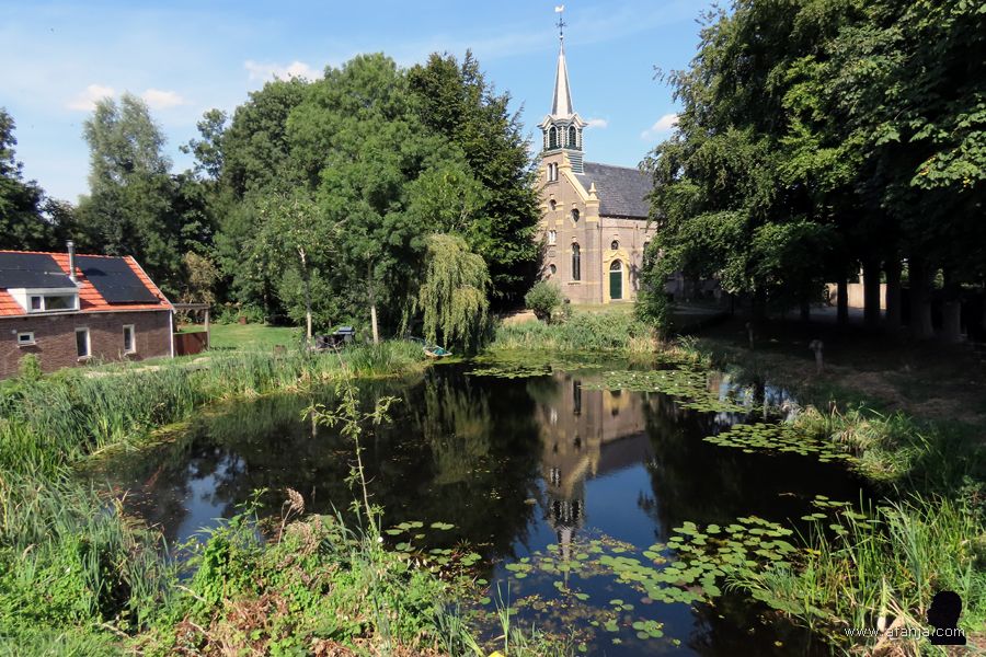 Wat nu nog resteert zijn vaak kleine, diepe poelen. En de zee, die is tegenwoordig ver weg, aan de westkant van de dijk ligt nu de Noordoostpolder. Aan één van de oude kolken staat de uit 1892 daterende kerk van Blankenham (Google Maps). Toen we daar waren, vroeg ik Jetske om even te stoppen …