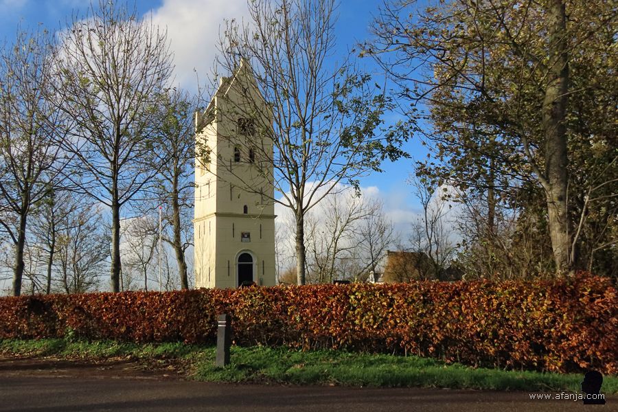 Zelf ben ik er wel vaker geweest, en we hebben er ook samen al eens rondgestruind. Maar dat maakt niet uit, sommige bouwwerken en objecten tonen zich in elk seizoen anders. Zo ook de toren van Eagum, die nu mooi door de bijna kale bomen schemert waar hij ’s zomers goeddeels schuil achter gaat. En het is gewoon een lief torentje …