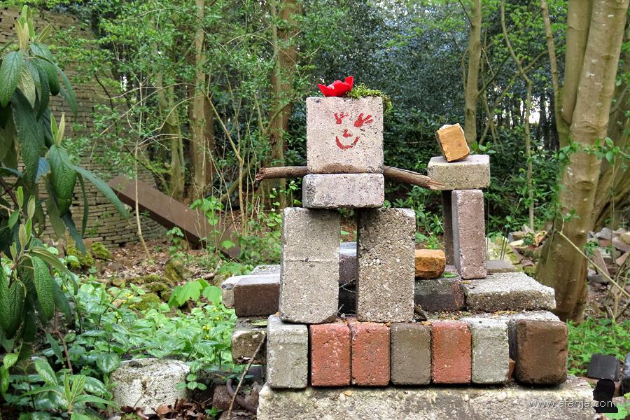 Daar wachtte me een verrassing. Niet ver van de koepel zag ik een grappig steenmannetje staan. Toen ik dichterbij kwam, zag ik meteen Marlou in dat vrolijke typetje. Er omheen lopend, ontdekte ik ook nog dat ze in gezelschap was van haar verloofde, die op schematische wijze linksachter Marlou was opgetrokken. Ik heb wel vaker gezegd, dat er soms vreemde krachten actief lijken te zijn in de Ecokathedraal, dat leek ook die dag weer echt het geval te zijn …