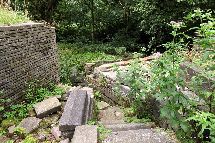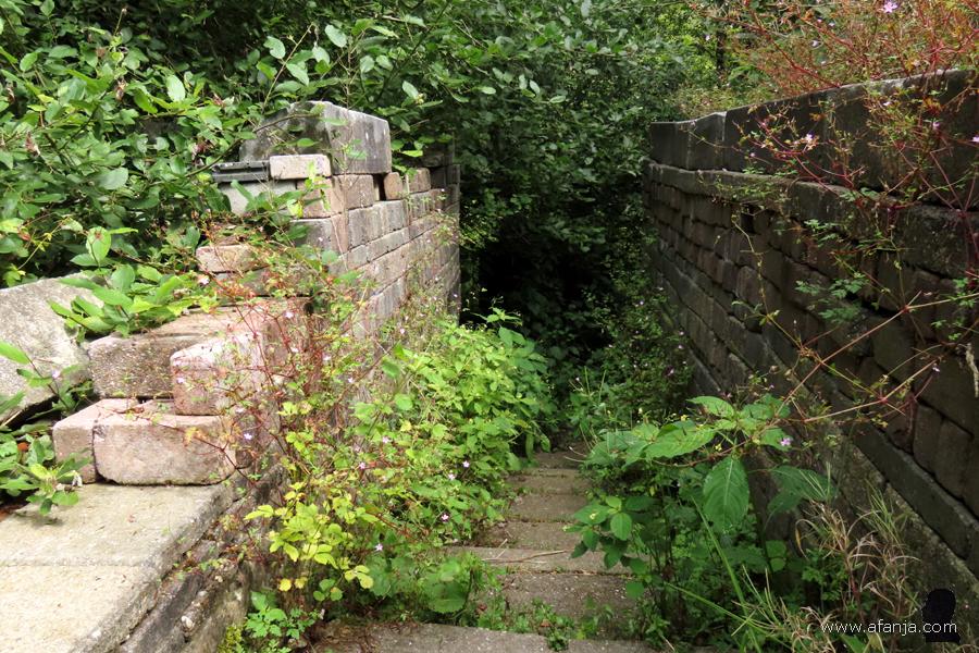 Nadat ik via deze omwegen de top had van de heuvel linksvoor in de Ecokathedraal had bereikt, heb ik even pauze genomen op één van de fijne zitplekjes die een paar muurtjes daar bieden. Daarna ben ik een donkere, dicht begroeide trap afgedaald, die de vast lezers misschien zullen herkennen van het logje ‘Last resorts (1)’...