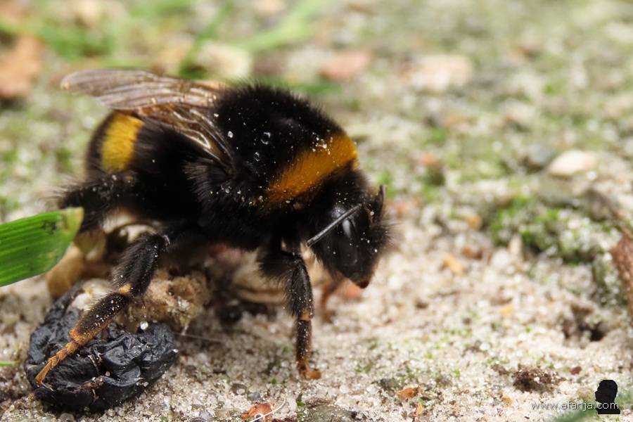 Dat leek hem wel goed te doen, want toen ik enige tijd later weer even bij hem keek, zag ik dat hij voorzichtig in het schoteltje rond scharrelde. Maar ik zag ook wat anders. De hommel had lifters bij zich … mijten …