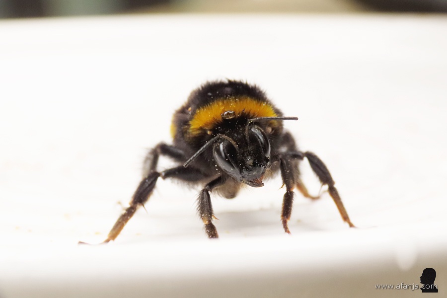 Dinsdagmiddag ben ik er eens lekker voor gaan zitten, en dat werd kennelijk gewaardeerd door een bezoekende aardhommel die wel even op de foto wilde …