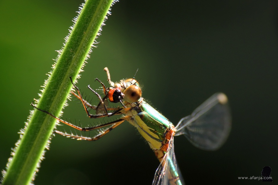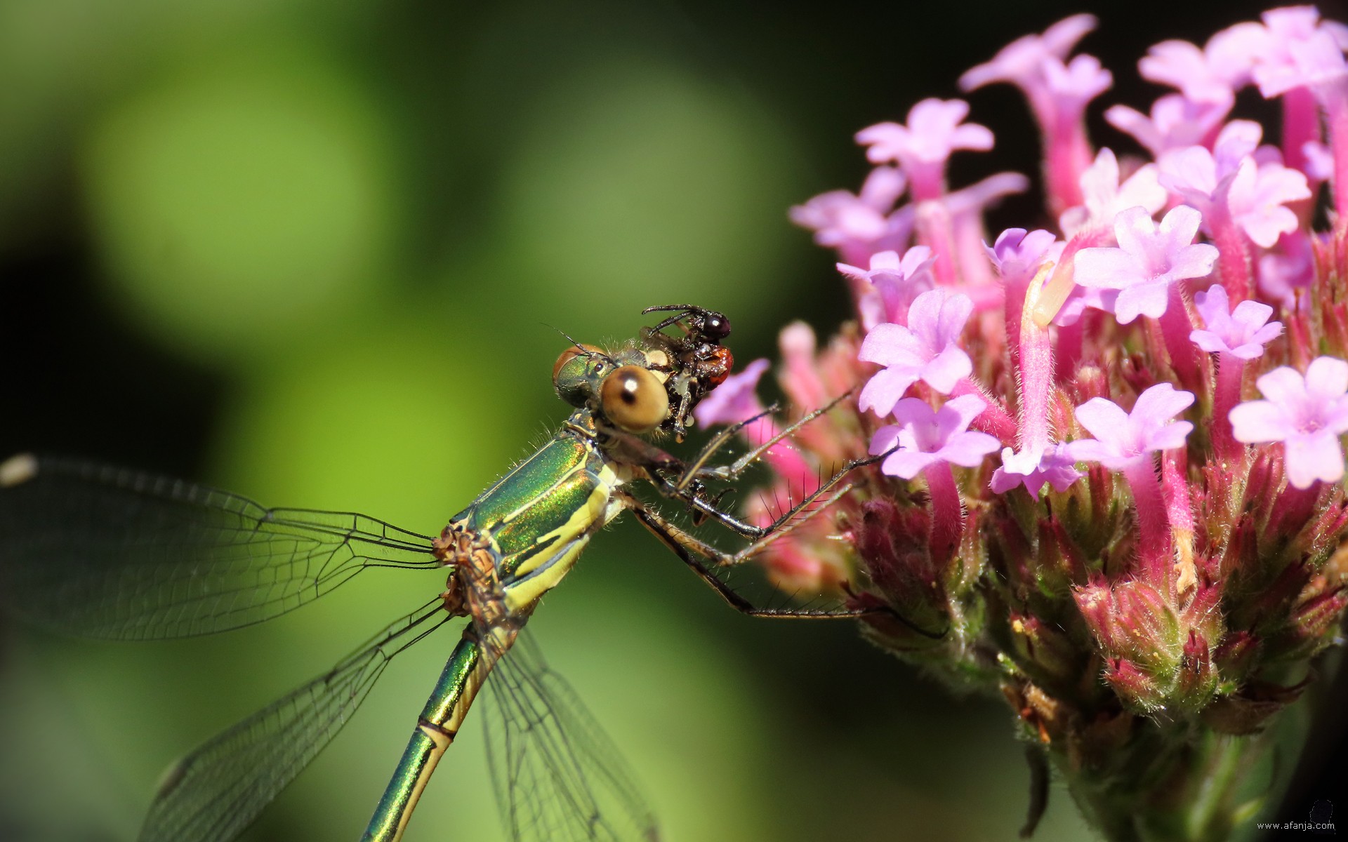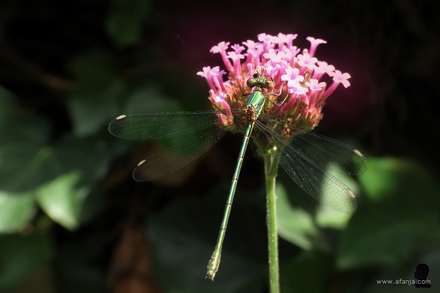 Begin augustus zag ik een waterjuffer neerstrijken op de ijzerhard. Al snel stond ik er met de camera bij. Aan de wijd gespreide vleugels was in één oogopslag te zien dat het een pantserjuffer was, een houtpantserjuffer om precies te zijn. Het was een mooi exemplaar met zijn typische metallic-groene kleur …