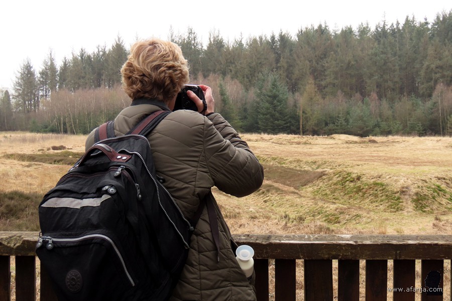 Een klein stukje verderop ligt links van de Beakendyk een oude schans in het landschap, de zogenaamde Romeinse Sterrenschans. Dit was een van de dingen die ik mijn fotomaatje wilde laten zien. Ze stortte zich meteen op het fotograferen van het nieuwe informatiepaneel bij de schans …