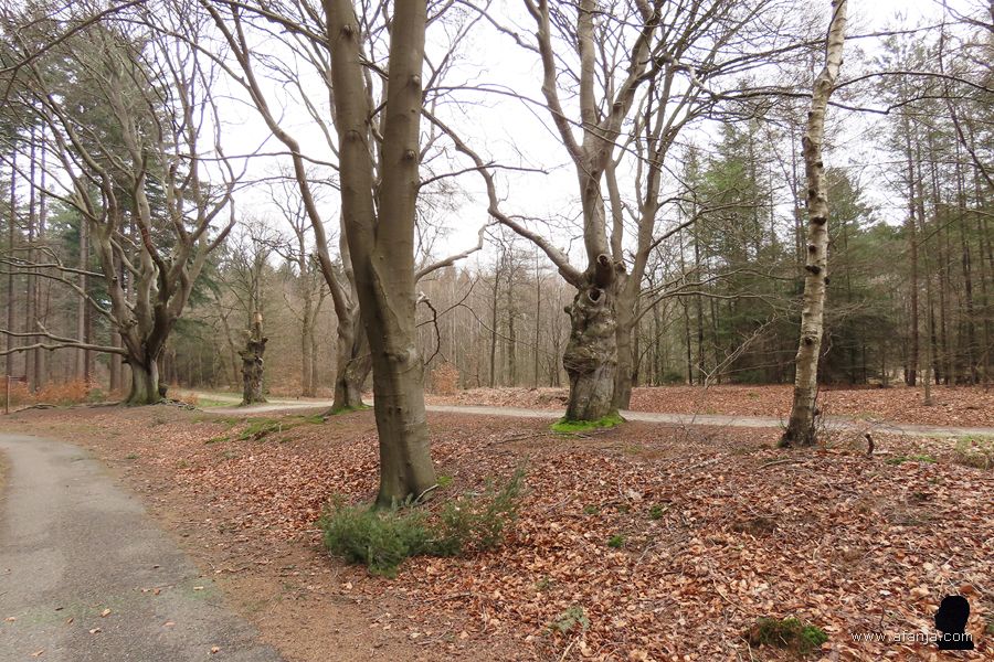 Op de geschiedenis van die oude schans kom ik in een vervolg nog terug. Nadat Jetske wat had rondgekeken en ik mijn onderdanen zittend op een bankje op het platform weer even rust had gegeven, stelde ik voor om nog een stukje verder te lopen. Daar wilde ik Jetske een aantal eeuwenoude beuken laten zien, dus we moesten weer doorrrr …
