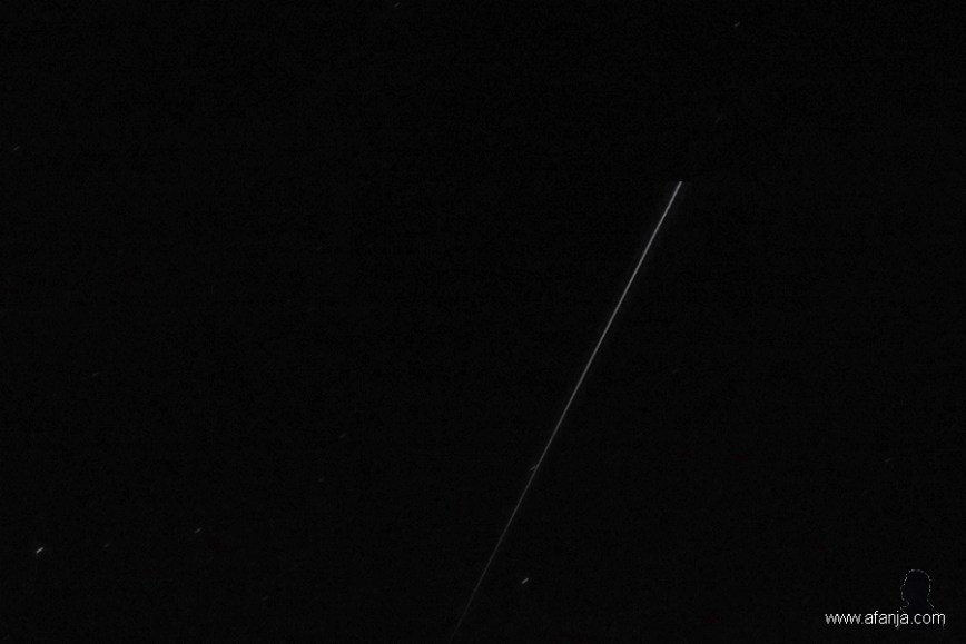 De tweede foto is 3 minuten later gemaakt. De ruim 4 minuten durende passage was toen al duidelijk over het hoogtepunt heen. Op deze foto ligt het start punt rechtsboven. Het ISS vliegt hier in oost-zuidoostelijke richting, waarbij je het ruimstation langzaam ziet vervagen, omdat het in de schaduw van de aarde komt …