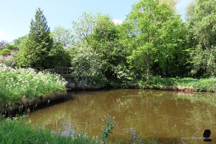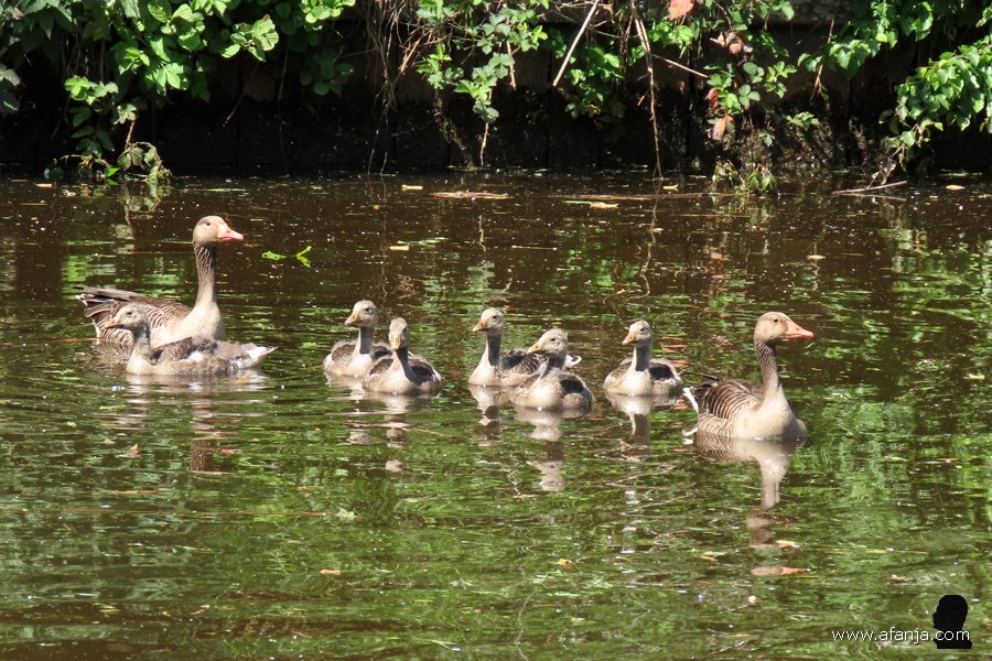 Een paar grauwe ganzen kwamen met hun zes al wat grotere jongen onder de brug door. Al snel ontdekten ze, dat ze in een doodlopend stuk water terechtgekomen waren …