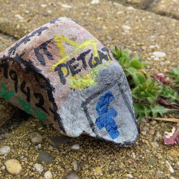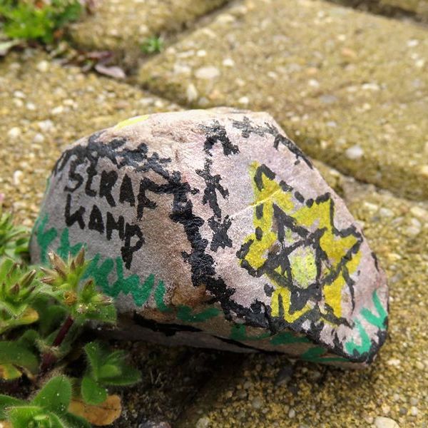Aan de voet van de palen staan een paar klompen, geflankeerd door een paar beschilderde kiezelstenen …