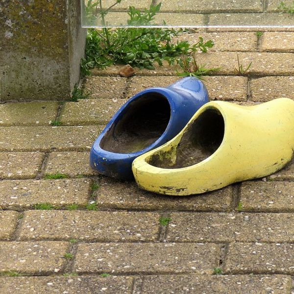 De schuur staat daar mooi op de hoek, maar verder is hij niet echt bijzonder. Mijn blik werd vooral getrokken door de beschilderde klompen, die er aan de muur hingen …