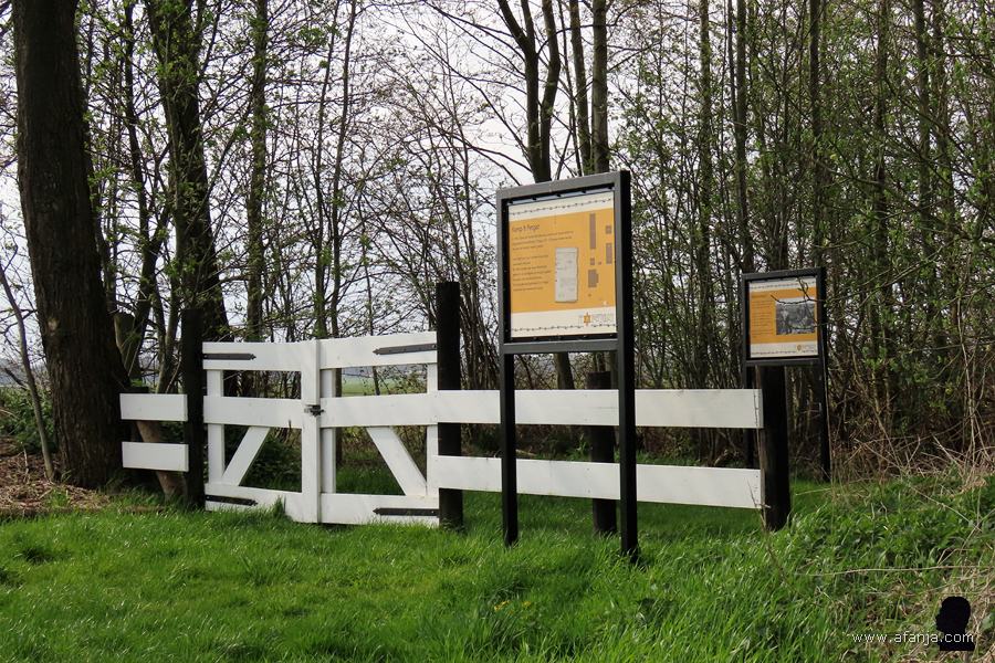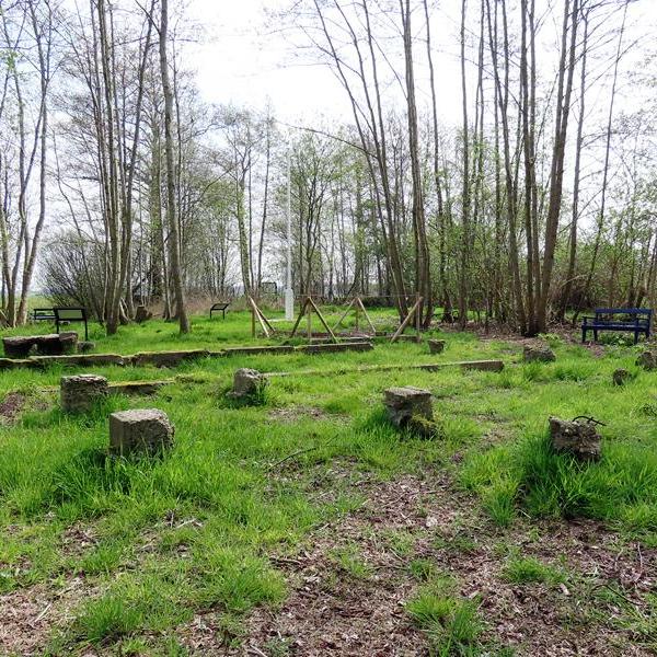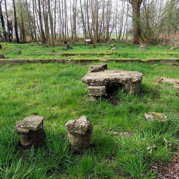 Het was een flinke kuier, maar we bereikten het kamp (Google Maps) toch nog vrij gemakkelijk. Van het kamp is overigens niet veel meer over dan de resten van de fundamenten, waarop de barakken en andere bouwwerken rustten. Het is een wonder dat deze restanten de ruilverkaveling overleefd hebben, maar geen enkele boer zag er brood in om de fundamenten uit de bodem te halen om het daarna bij zijn land te trekken. We hebben er een tijdlang stilletjes rond gestapt …