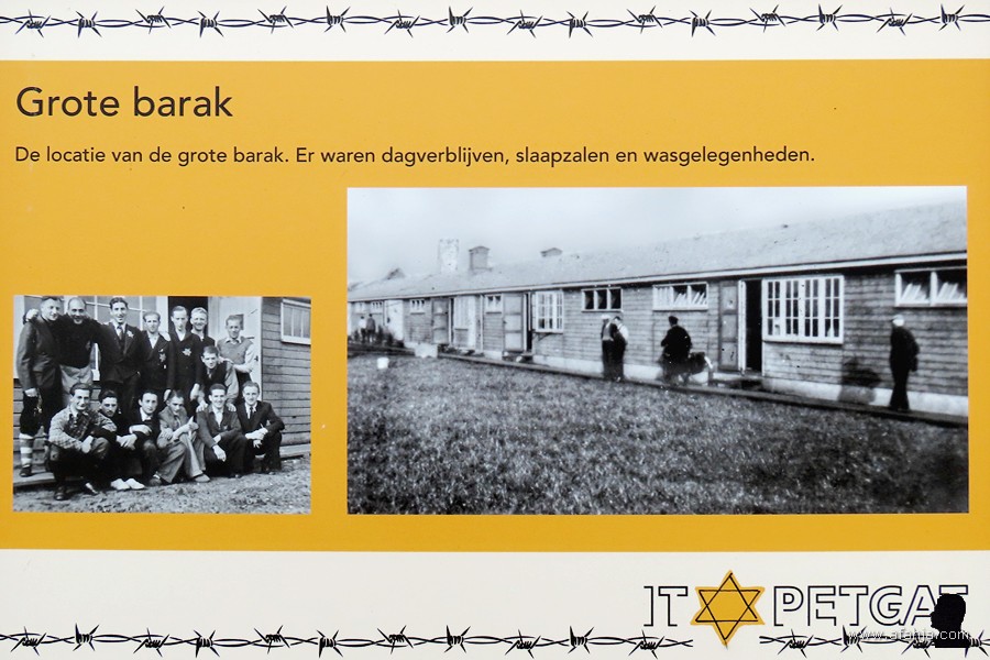 Aan het begin van het 400 meter lange pad naar het kamp staat een bord met daarop een foto van de onthulling van het monument door Sjaak Stibbe in 2003. Stibbe was één van de weinige inwoners van het kamp die niet in de gaskamers zijn geëindigd …