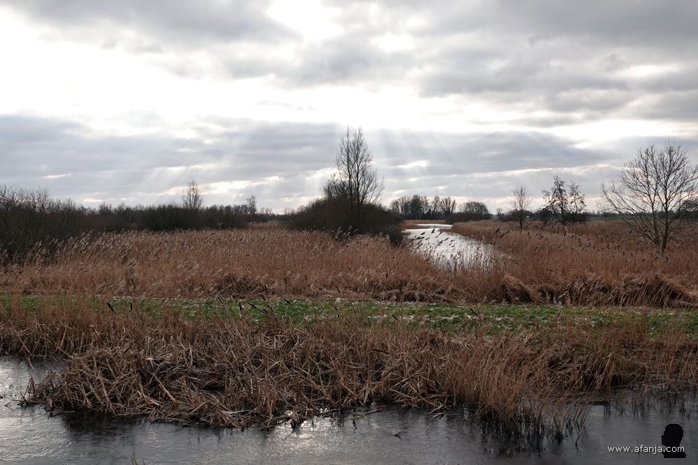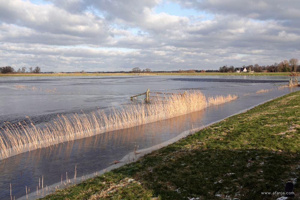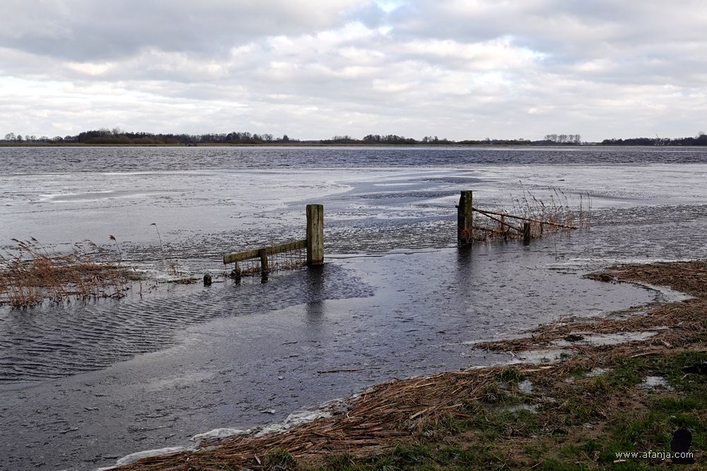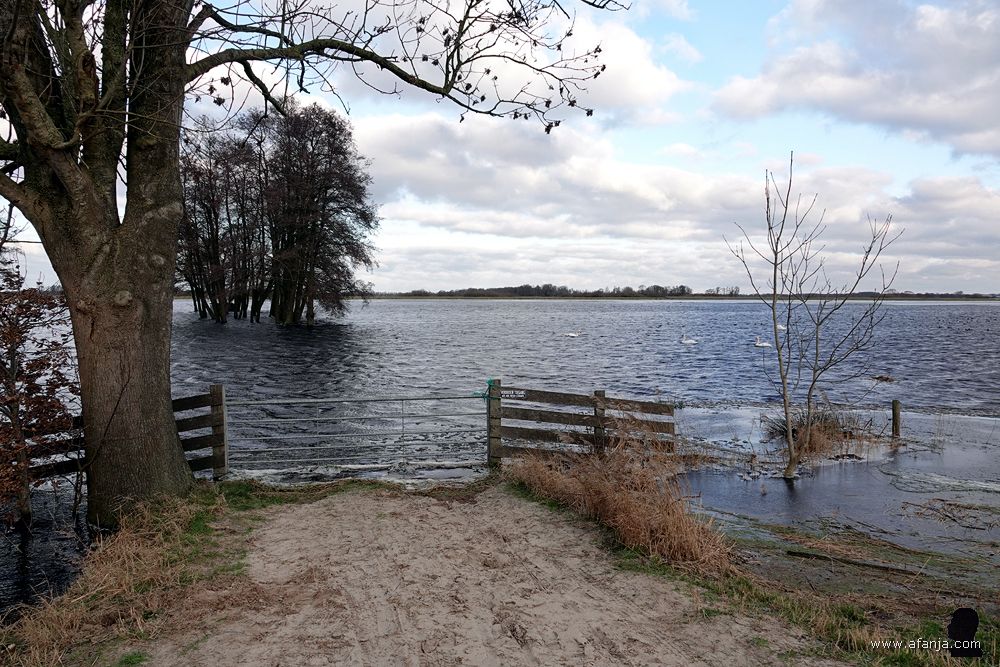 Terugkomend uit de hut heb ik nog even overwogen om op onderzoek te gaan naar het waarom van de rijplaten die kennelijk onlangs over het zandpad zijn gelegd. Mijn onderdanen verkeerden in goeie conditie, maar na een meter of tien hield ik het toch maar voor gezien. De natte rijplaten waren akelig glad, en dat maakte het lopen niet fijner. Het bordje ‘(Brom)fietsers Afstappen’ zal er ook wel niet voor niets geplaatst zijn. Later nog maar eens kijken …