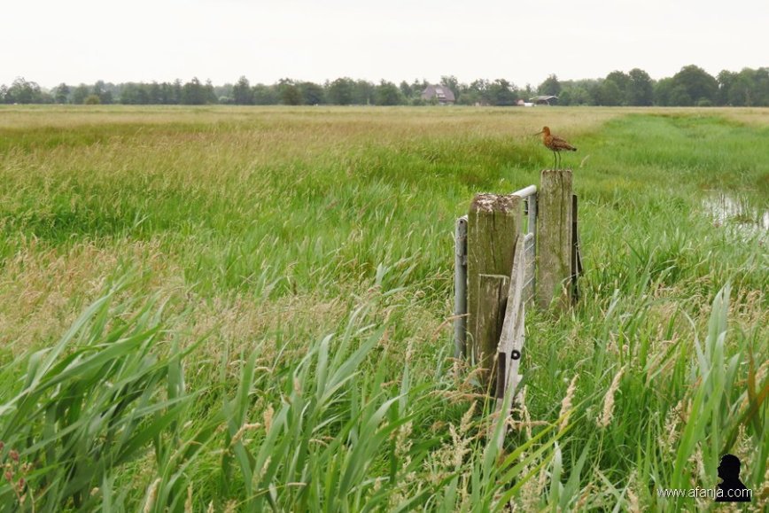 Rechts van de weg staat een grutto te roepen op een dampaal bij een nog ongemaaid weiland …