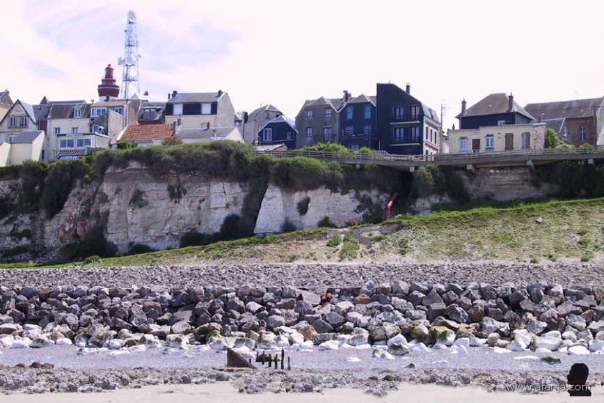Vanaf deze kant is mooi te zien dat er aan de voet van de krijtrots een beschermende strook van beton en rotsblokken is aangebracht. Op verschillende plaatsen steken scherpe stalen pennen omhoog, geen idee waar die voor dienen. Ook liggen er her en der keien en stukken steen. Dus nee, een fijne plek om te zwemmen of te pootjebaden is ’t volgens mij niet, Bertie …