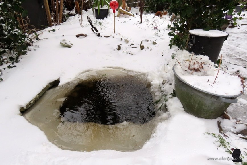 Vanmiddag heb ik dus de strijd met het ijs nogmaals aangebonden. Zonder hakken, maar met gepast geweld, heb ik het intussen al dik aangekoekte sneeuwijs weer weggehaald. Voor vannacht worden er opnieuw wat sneeuwbuien verwacht, in dat geval zal ik morgen waarschijnlijk nog eens aan de slag moeten. Als het niet weer gaat sneeuw, dan laat ik het vanaf nu maar aan de natuur over. Wanneer we echt strenge vorst krijgen, dan lukt het zonder hakken toch niet meer om de vijver open te houden. En dat hakken wil ik de vissen niet aandoen …
