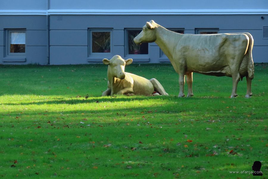 In de voortuin van het hotel bevinden zich al enkele jaren een paar kunstkoeien. Het laagje goudverf zal wel symbool staan voor de gouden kranen die badkamers, wastafels en toiletten waarschijnlijk sieren … 😉