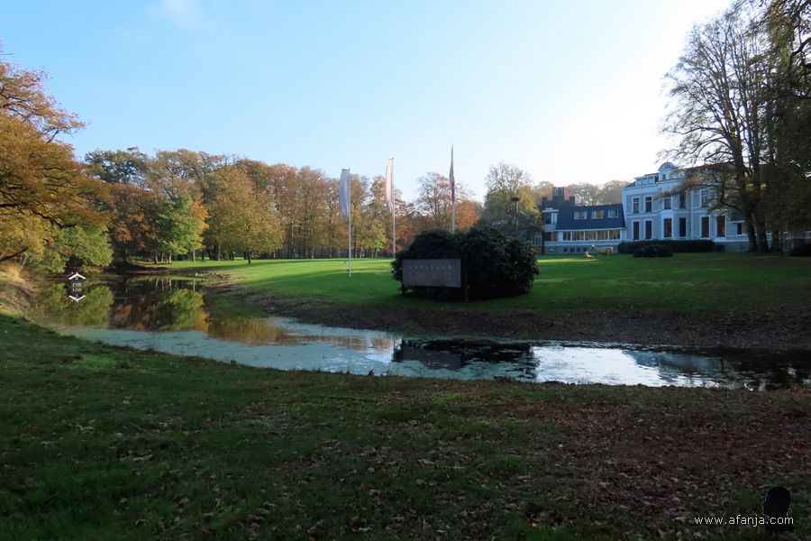 Intussen had ik weliswaar al een vermoeden waar ik me bevond, maar dat werd pas bevestigd toen ik even later aan de bosrand stond. Aan mijn linkerzijde strekte zich een glooiende en gladgeschoren golfbaan uit, aan mijn rechterzijde stond het vermaarde Hotel Lauswolt. Het beste nieuws was echter nog, dat er een bankje stond waar ik een tijdje lekker heb kunnen zitten, zodat mijn benen weer wat kracht konden verzamelen, want het was duidelijk dat ik nog een flinke wandeling voor de boeg had …
