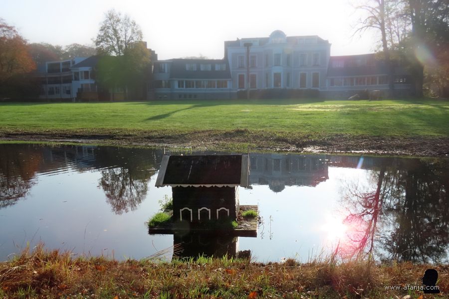 In de vijver voor het hotel drijft een eendenhotel. De eenden hadden al de wijk genomen, toen ze mij vanuit de verte zagen naderen …