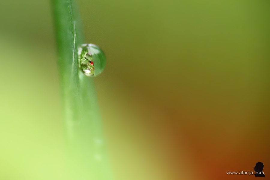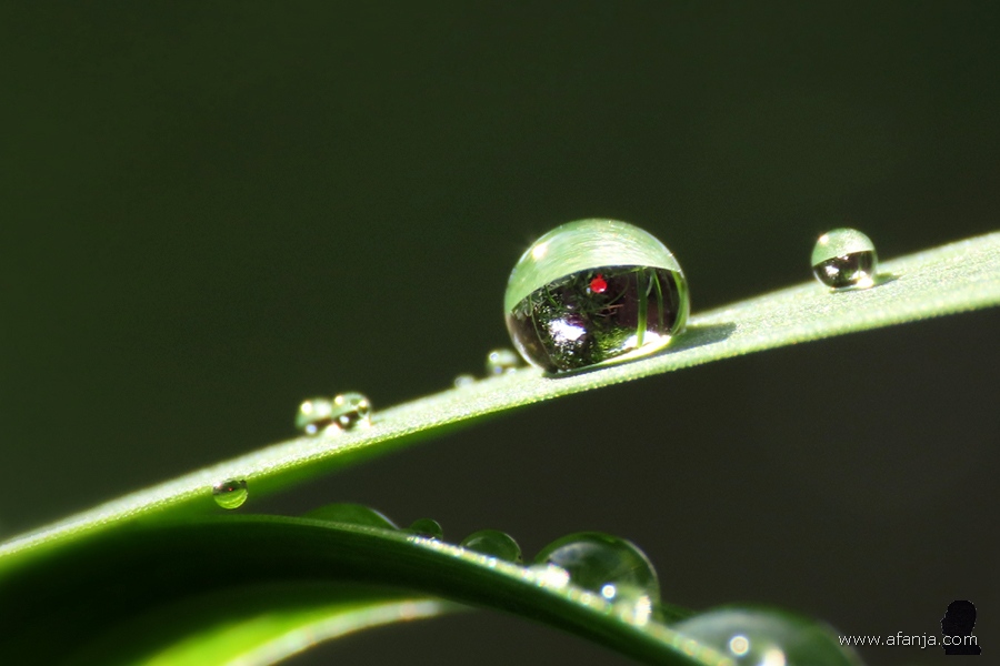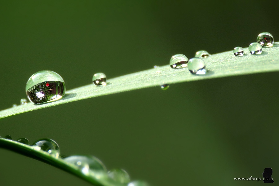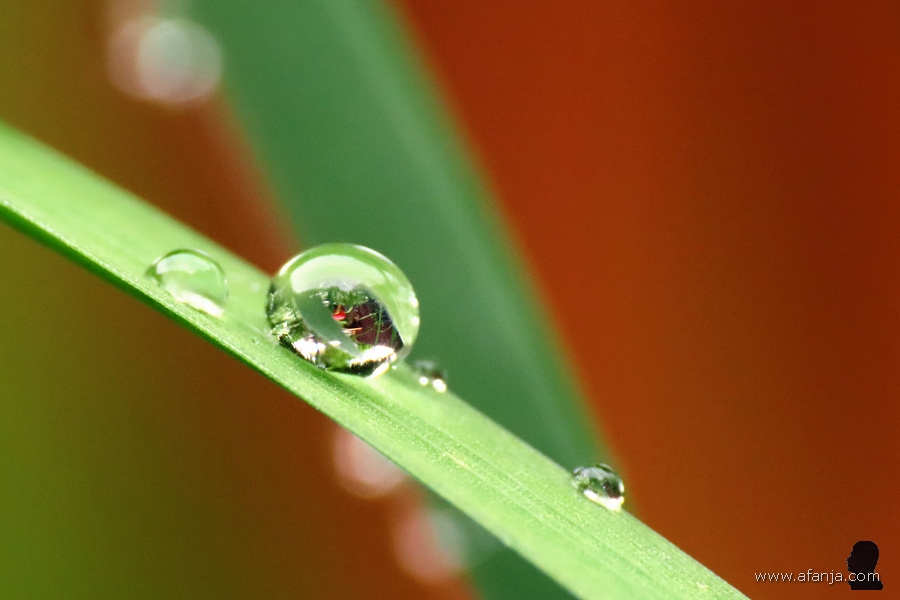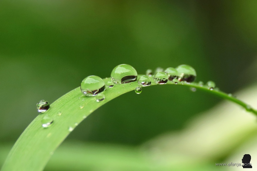 Ik sluit deze nieuwe serie druppelstudies af met een opname van een heel klein druppeltje. Krampachtig bleef het zich vasthouden aan het rechtop staande blad, dat zachtjes heen en weer wiegde in de wind …