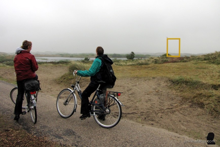 Hongerig en verregend fietsten we voort. De warmte van ons weekendverblijf lokte. Voordat we daar waren werden we echter geconfronteerd met het reusachtige gele logo van National Geographic. Snel heb ik vanaf het fietspad een paar foto’s gemaakt. In een volgend deel van deze serie kom ik nog terug op dit logo …