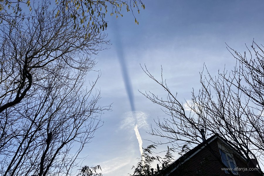 Zo zag ik zondagmiddag hoe het witte condensspoor van een de zon tegemoet vliegend vliegtuig, verdween in zijn eigen schaduw. Van dat soort momenten kan ik echt genieten …